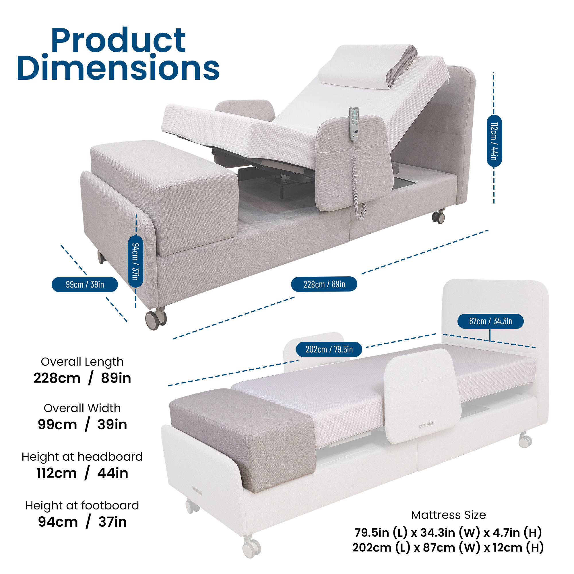 Designed with sturdy side rails and a stable anti-slip base, Elevra ensures secure, controlled transitions every time. The precision motorized adjustments move smoothly and steadily, allowing you to maintain independence without compromising safety—for peace of mind, day and night.