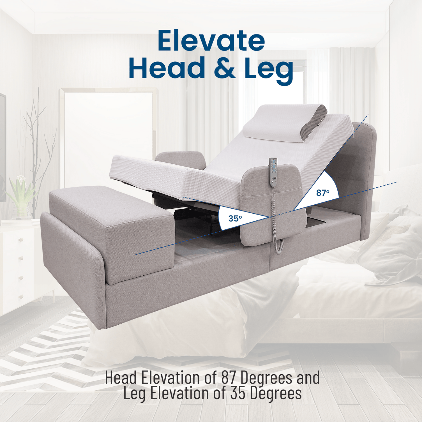 (Independently control head elevation up to 87° and leg elevation up to 35°, promoting optimal circulation, pressure relief, and customized relaxation.)