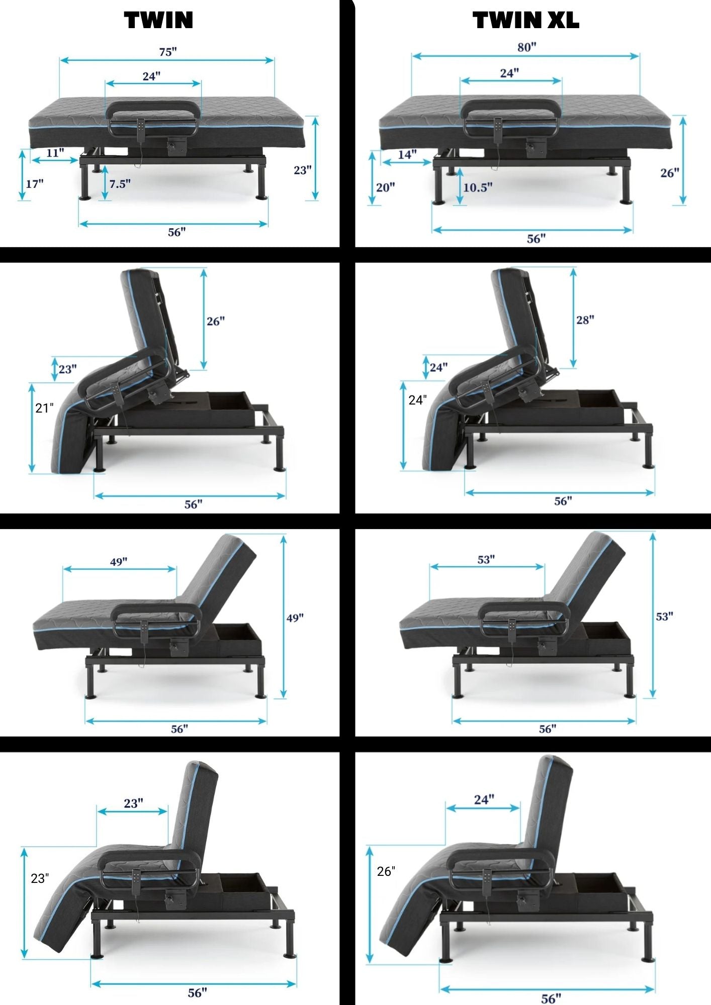 Twin XL: 80" long, 26" high (for users 5’10″ and taller)